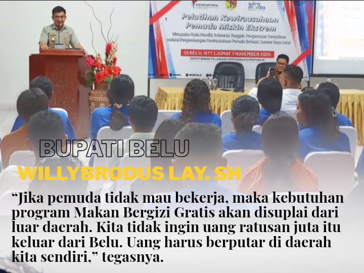 Atambua,mediatihar.com- Bupati Belu, Willybrodus Lay, SH, membuka Pelatihan Kewirausahaan Pemuda Miskin Ekstrem dengan tema “Wirausaha Muda Mandiri, Indonesia Tangguh: Pengentasan Kemiskinan melalui Pengembangan Kewirausahaan Pemuda Berbasis Sumber Daya Lokal” yang berlangsung di Lantai I Kantor Bupati Belu. Jumat (07/11/2025).