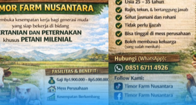 Berita NTT Tanpa Syarat Ijazah! Timor Farm Nusantara Buka Lowongan Petani Milenial dengan Gaji hingga Rp5 Juta dan fasilitas mess! BERITA, DAERAH, NASIONAL, PERTANIAN|December 24, 2025by Haman Hendrikus ATAMBUA,Mediatihar.Com – Sektor pertanian dan peternakan di wilayah Timor kini semakin membuka