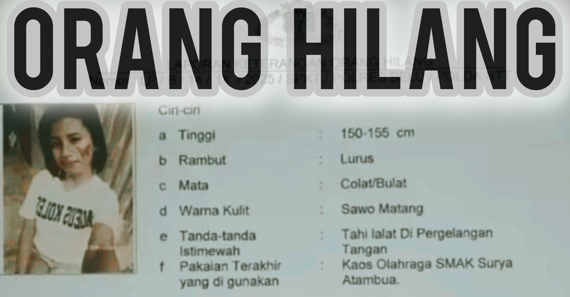 Pesan tersebut menyebutkan bahwa Indah terakhir kali terlihat pada hari Sabtu sekitar pukul 15.00 WITA. Saat itu, ia mengenakan seragam olahraga SMAK Surya Atambua, sekolah tempatnya menuntut ilmu.